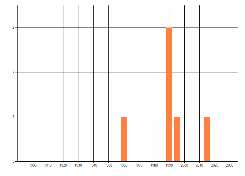 Het aantal atlasblokken (5x5 km) waarin de soort is gemeld binnen een periode van vijf jaar (vanaf 1980) of twintig jaar. Niet gecorrigeerd voor waarnemersinspanning en het aantal doorgegeven waarnemingen kan sterk variëren per periode, dus een trend in verspreiding kan hier niet direct uit worden afgelezen. Het opgegeven jaartal is het eerste jaar van de periode. Bron: gevalideerde waarnemingen uit de NDFF.