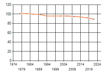 Gemiddelde trend van het aantal kilometerhokken waarin de soort voorkomt, weergegeven als indexcijfer (1975-1978 = 100).