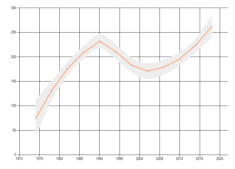 Gemiddelde trend van het aantal kilometerhokken waarin de soort voorkomt, weergegeven als indexcijfer (1975-1978 = 100).