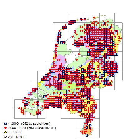 CC BY-NC-SA 3.0 NLVerspreidingNederlandVerspreid door vrijwel het hele land. Vrij zeldzaam op de zandgronden in het oosten, midden en zuiden van het land en in de Hollandse en Zeeuwse duinen en zeldzaam in laagveengebieden. Elders zeer zeldzaam. Vrijwel niet in Flevoland.