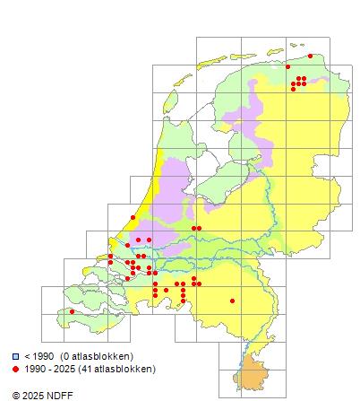 Het aantal atlasblokken (5x5 km) waarin de soort is gemeld binnen een periode van vijf jaar (vanaf 1980) of twintig jaar. Niet gecorrigeerd voor waarnemersinspanning en het aantal doorgegeven waarnemingen kan sterk variëren per periode, dus een trend in verspreiding kan hier niet direct uit worden afgelezen. Het opgegeven jaartal is het eerste jaar van de periode. Bron: gevalideerde waarnemingen uit de NDFF.