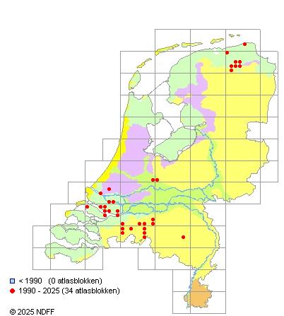 Het aantal atlasblokken (5x5 km) waarin de soort is gemeld binnen een periode van vijf jaar (vanaf 1980) of twintig jaar. Niet gecorrigeerd voor waarnemersinspanning en het aantal doorgegeven waarnemingen kan sterk variëren per periode, dus een trend in verspreiding kan hier niet direct uit worden afgelezen. Het opgegeven jaartal is het eerste jaar van de periode. Bron: gevalideerde waarnemingen uit de NDFF.