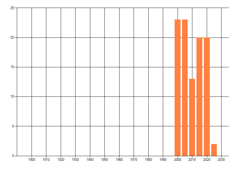 Het aantal atlasblokken (5x5 km) waarin de soort is gemeld binnen een periode van vijf jaar (vanaf 1980) of twintig jaar. Niet gecorrigeerd voor waarnemersinspanning en het aantal doorgegeven waarnemingen kan sterk variëren per periode, dus een trend in verspreiding kan hier niet direct uit worden afgelezen. Het opgegeven jaartal is het eerste jaar van de periode. Bron: gevalideerde waarnemingen uit de NDFF.