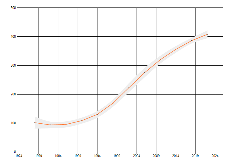 Gemiddelde trend van het aantal kilometerhokken waarin de soort voorkomt, weergegeven als indexcijfer (1975-1978 = 100).
