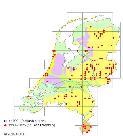 Het aantal atlasblokken (5x5 km) waarin de soort is gemeld binnen een periode van vijf jaar (vanaf 1980) of twintig jaar. Niet gecorrigeerd voor waarnemersinspanning en het aantal doorgegeven waarnemingen kan sterk variëren per periode, dus een trend in verspreiding kan hier niet direct uit worden afgelezen. Het opgegeven jaartal is het eerste jaar van de periode. Bron: gevalideerde waarnemingen uit de NDFF.
