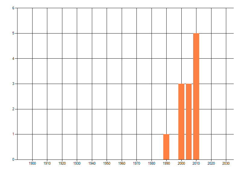 Het aantal atlasblokken (5x5 km) waarin de soort is gemeld binnen een periode van vijf jaar (vanaf 1980) of twintig jaar. Niet gecorrigeerd voor waarnemersinspanning en het aantal doorgegeven waarnemingen kan sterk variëren per periode, dus een trend in verspreiding kan hier niet direct uit worden afgelezen. Het opgegeven jaartal is het eerste jaar van de periode. Bron: gevalideerde waarnemingen uit de NDFF.