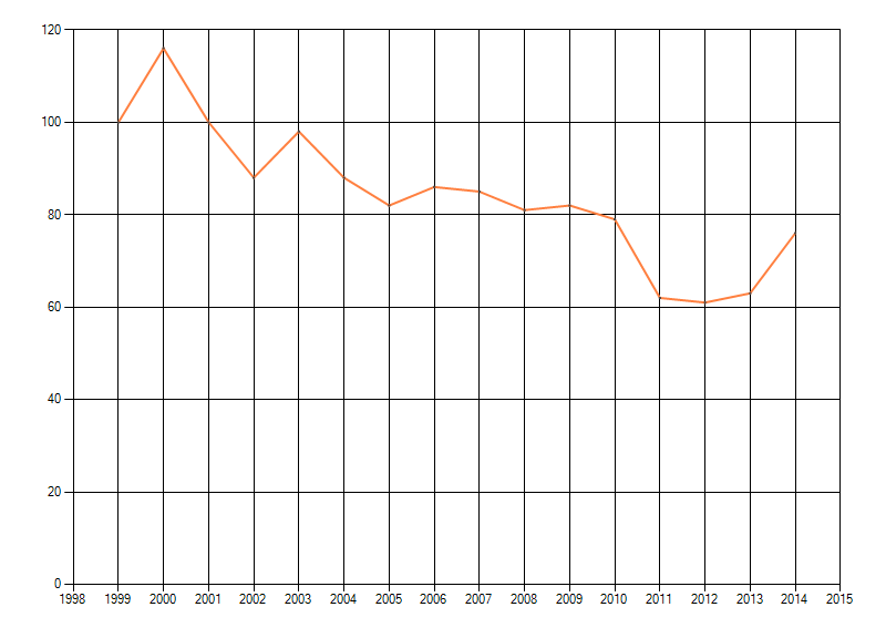 Trend in het geschatte aantal individuen van paddenstoelen in bossen op de hoge zandgronden, weergegeven als indexcijfer (eerste jaar = 100). Bron: