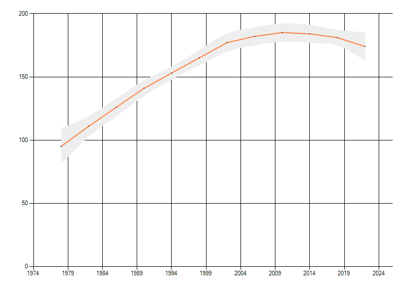 Gemiddelde trend van het aantal kilometerhokken waarin de soort voorkomt, weergegeven als indexcijfer (1975-1978 = 100).