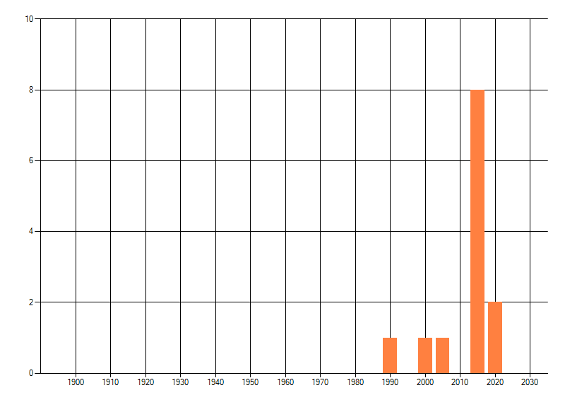 Het aantal atlasblokken (5x5 km) waarin de soort is gemeld binnen een periode van vijf jaar (vanaf 1980) of twintig jaar. Niet gecorrigeerd voor waarnemersinspanning en het aantal doorgegeven waarnemingen kan sterk variëren per periode, dus een trend in verspreiding kan hier niet direct uit worden afgelezen. Het opgegeven jaartal is het eerste jaar van de periode. Bron: gevalideerde waarnemingen uit de NDFF.