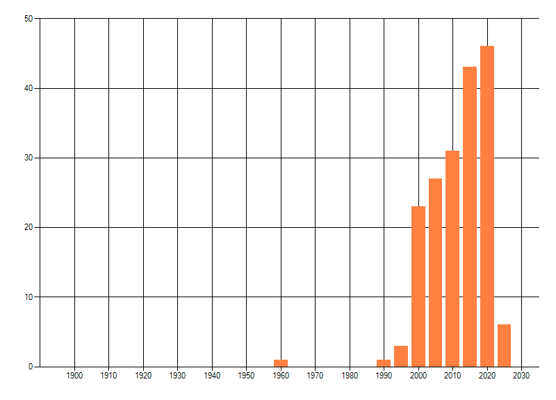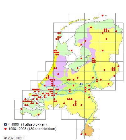 Het aantal atlasblokken (5x5 km) waarin de soort is gemeld binnen een periode van vijf jaar (vanaf 1980) of twintig jaar. Niet gecorrigeerd voor waarnemersinspanning en het aantal doorgegeven waarnemingen kan sterk variëren per periode, dus een trend in verspreiding kan hier niet direct uit worden afgelezen. Het opgegeven jaartal is het eerste jaar van de periode. Bron: gevalideerde waarnemingen uit de NDFF.