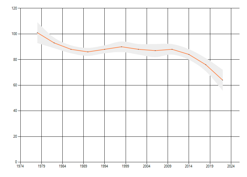 Gemiddelde trend van het aantal kilometerhokken waarin de soort voorkomt, weergegeven als indexcijfer (1975-1978 = 100).
