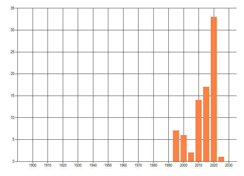 Het aantal atlasblokken (5x5 km) waarin de soort is gemeld binnen een periode van vijf jaar (vanaf 1980) of twintig jaar. Niet gecorrigeerd voor waarnemersinspanning en het aantal doorgegeven waarnemingen kan sterk variëren per periode, dus een trend in verspreiding kan hier niet direct uit worden afgelezen. Het opgegeven jaartal is het eerste jaar van de periode. Bron: gevalideerde waarnemingen uit de NDFF.