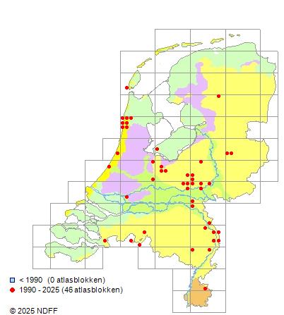 Het aantal atlasblokken (5x5 km) waarin de soort is gemeld binnen een periode van vijf jaar (vanaf 1980) of twintig jaar. Niet gecorrigeerd voor waarnemersinspanning en het aantal doorgegeven waarnemingen kan sterk variëren per periode, dus een trend in verspreiding kan hier niet direct uit worden afgelezen. Het opgegeven jaartal is het eerste jaar van de periode. Bron: gevalideerde waarnemingen uit de NDFF.