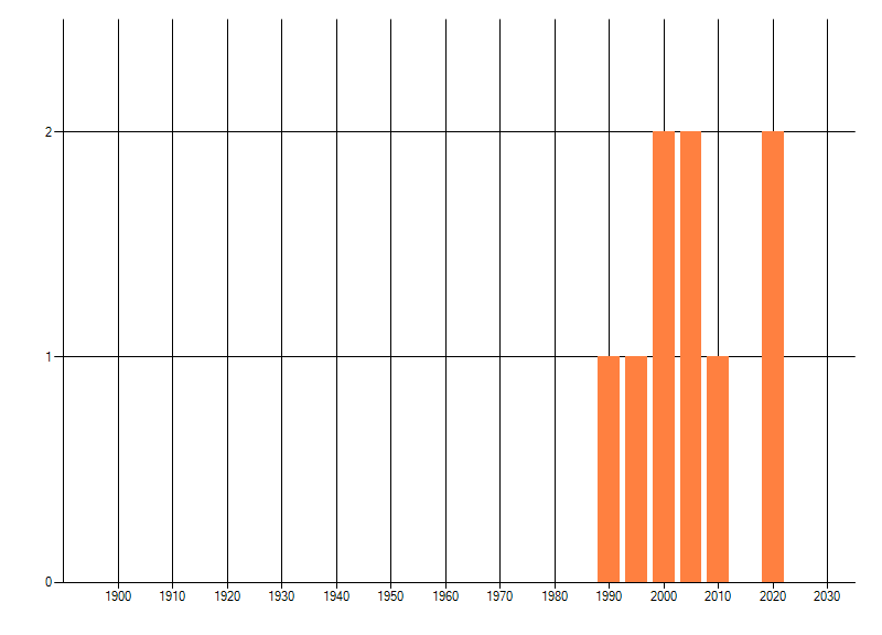 Het aantal atlasblokken (5x5 km) waarin de soort is gemeld binnen een periode van vijf jaar (vanaf 1980) of twintig jaar. Niet gecorrigeerd voor waarnemersinspanning en het aantal doorgegeven waarnemingen kan sterk variëren per periode, dus een trend in verspreiding kan hier niet direct uit worden afgelezen. Het opgegeven jaartal is het eerste jaar van de periode. Bron: gevalideerde waarnemingen uit de NDFF.