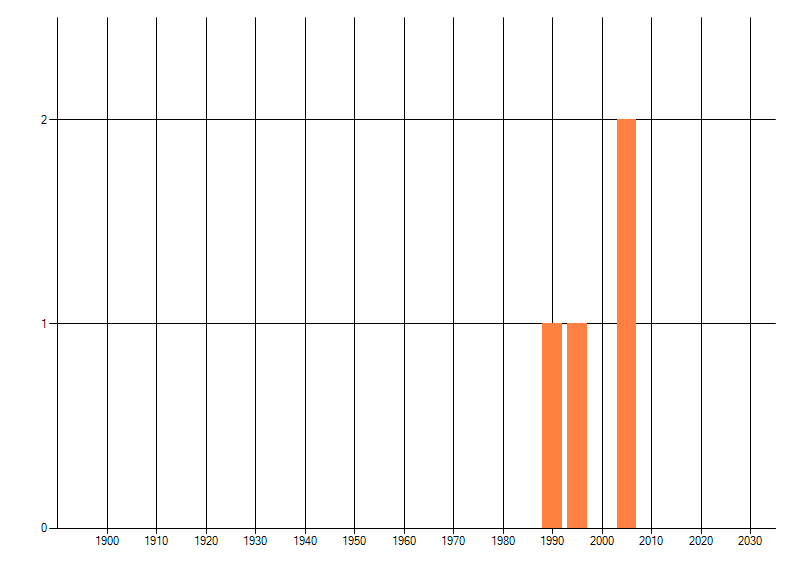 Het aantal atlasblokken (5x5 km) waarin de soort is gemeld binnen een periode van vijf jaar (vanaf 1980) of twintig jaar. Niet gecorrigeerd voor waarnemersinspanning en het aantal doorgegeven waarnemingen kan sterk variëren per periode, dus een trend in verspreiding kan hier niet direct uit worden afgelezen. Het opgegeven jaartal is het eerste jaar van de periode. Bron: gevalideerde waarnemingen uit de NDFF.