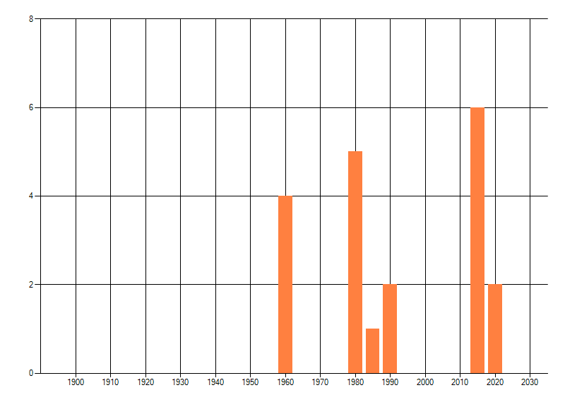 Het aantal atlasblokken (5x5 km) waarin de soort is gemeld binnen een periode van vijf jaar (vanaf 1980) of twintig jaar. Niet gecorrigeerd voor waarnemersinspanning en het aantal doorgegeven waarnemingen kan sterk variëren per periode, dus een trend in verspreiding kan hier niet direct uit worden afgelezen. Het opgegeven jaartal is het eerste jaar van de periode. Bron: gevalideerde waarnemingen uit de NDFF.