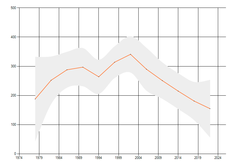 Gemiddelde trend van het aantal kilometerhokken waarin de soort voorkomt, weergegeven als indexcijfer (1975-1978 = 100). De trend is gecorrigeerd voor waarnemersinspanning en geeft de relatieve verandering in het aantal bezette kilometerhokken weer. Voor de berekening worden de data per periode van vier jaar samengenomen. In de grafiek correspondeert ieder punt met het laatste jaar van zo'n periode.
