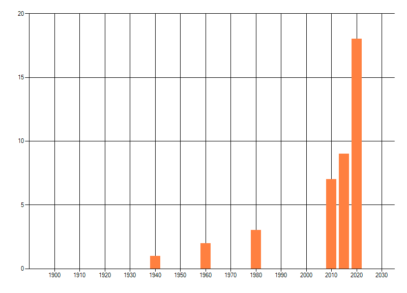 Het aantal atlasblokken (5x5 km) waarin de soort is gemeld binnen een periode van vijf jaar (vanaf 1980) of twintig jaar. Niet gecorrigeerd voor waarnemersinspanning en het aantal doorgegeven waarnemingen kan sterk variëren per periode, dus een trend in verspreiding kan hier niet direct uit worden afgelezen. Het opgegeven jaartal is het eerste jaar van de periode. Bron: gevalideerde waarnemingen uit de NDFF.