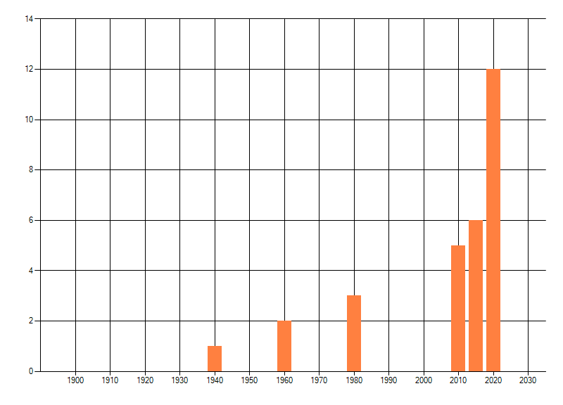 Het aantal atlasblokken (5x5 km) waarin de soort is gemeld binnen een periode van vijf jaar (vanaf 1980) of twintig jaar. Niet gecorrigeerd voor waarnemersinspanning en het aantal doorgegeven waarnemingen kan sterk variëren per periode, dus een trend in verspreiding kan hier niet direct uit worden afgelezen. Het opgegeven jaartal is het eerste jaar van de periode. Bron: gevalideerde waarnemingen uit de NDFF.