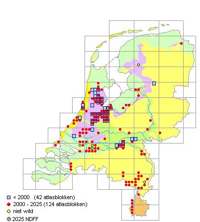 Gemiddelde trend van het aantal kilometerhokken waarin de soort voorkomt, weergegeven als indexcijfer (1975-1978 = 100). De trend is gecorrigeerd voor waarnemersinspanning en geeft de relatieve verandering in het aantal bezette kilometerhokken weer. Voor de berekening worden de data per periode van vier jaar samengenomen. In de grafiek correspondeert ieder punt met het laatste jaar van zo'n periode.