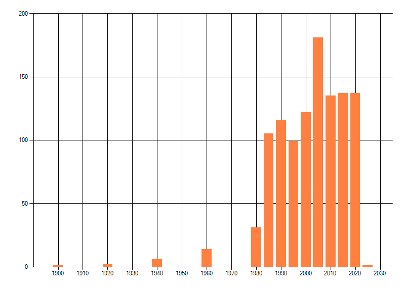 Het aantal atlasblokken (5x5 km) waarin de soort is gemeld binnen een periode van vijf jaar (vanaf 1980) of twintig jaar. Niet gecorrigeerd voor waarnemersinspanning en het aantal doorgegeven waarnemingen kan sterk variëren per periode, dus een trend in verspreiding kan hier niet direct uit worden afgelezen. Het opgegeven jaartal is het eerste jaar van de periode. Bron: gevalideerde waarnemingen uit de NDFF.