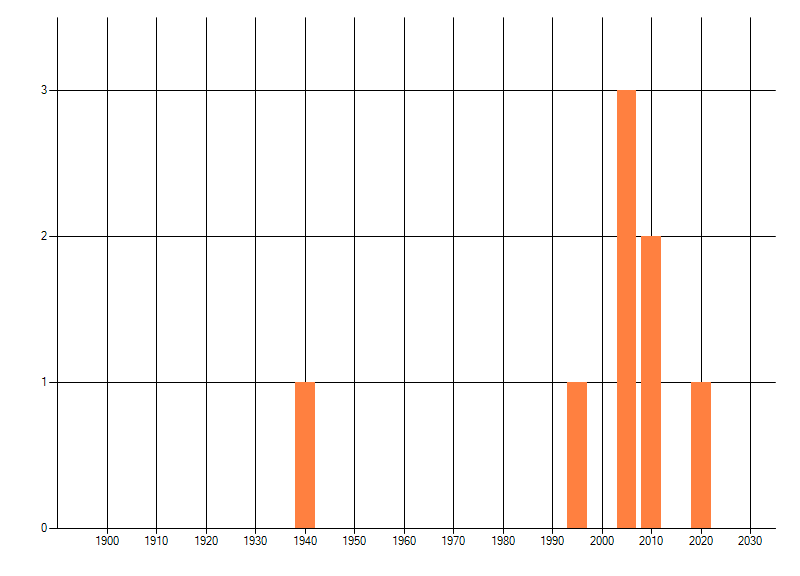 Het aantal atlasblokken (5x5 km) waarin de soort is gemeld binnen een periode van vijf jaar (vanaf 1980) of twintig jaar. Niet gecorrigeerd voor waarnemersinspanning en het aantal doorgegeven waarnemingen kan sterk variëren per periode, dus een trend in verspreiding kan hier niet direct uit worden afgelezen. Het opgegeven jaartal is het eerste jaar van de periode. Bron: gevalideerde waarnemingen uit de NDFF.