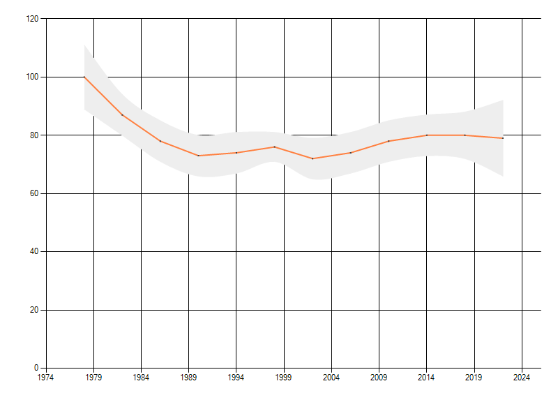 Gemiddelde trend van het aantal kilometerhokken waarin de soort voorkomt, weergegeven als indexcijfer (1975-1978 = 100).