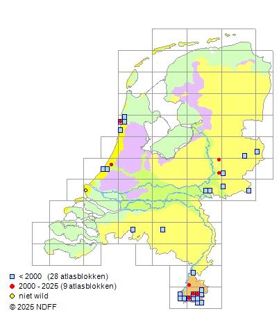Het aantal atlasblokken (5x5 km) waarin de soort is gemeld binnen een periode van vijf jaar (vanaf 1980) of twintig jaar. Niet gecorrigeerd voor waarnemersinspanning en het aantal doorgegeven waarnemingen kan sterk variëren per periode, dus een trend in verspreiding kan hier niet direct uit worden afgelezen. Het opgegeven jaartal is het eerste jaar van de periode. Bron: gevalideerde waarnemingen uit de NDFF.
