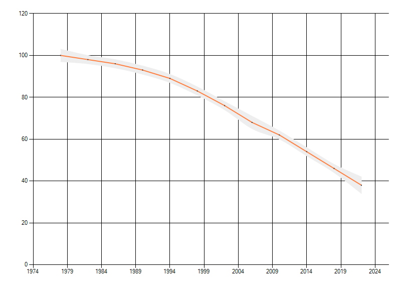 Gemiddelde trend van het aantal kilometerhokken waarin de soort voorkomt, weergegeven als indexcijfer (1975-1978 = 100).