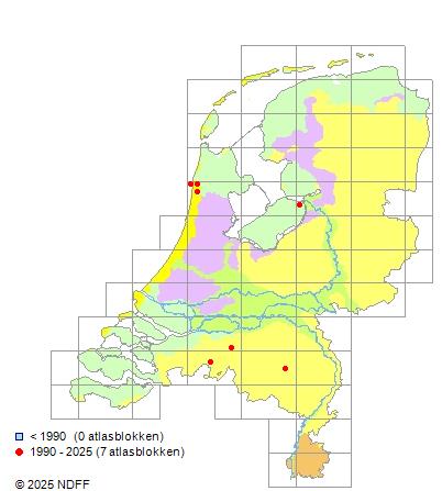 Het aantal atlasblokken (5x5 km) waarin de soort is gemeld binnen een periode van vijf jaar (vanaf 1980) of twintig jaar. Niet gecorrigeerd voor waarnemersinspanning en het aantal doorgegeven waarnemingen kan sterk variëren per periode, dus een trend in verspreiding kan hier niet direct uit worden afgelezen. Het opgegeven jaartal is het eerste jaar van de periode. Bron: gevalideerde waarnemingen uit de NDFF.