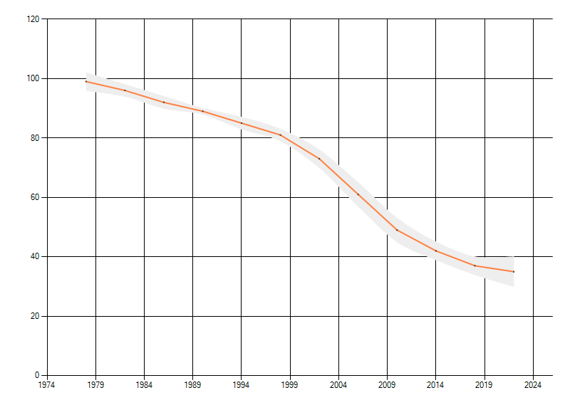 Gemiddelde trend van het aantal kilometerhokken waarin de soort voorkomt, weergegeven als indexcijfer (1975-1978 = 100). De trend is gecorrigeerd voor waarnemersinspanning en geeft de relatieve verandering in het aantal bezette kilometerhokken weer. Voor de berekening worden de data per periode van vier jaar samengenomen. In de grafiek correspondeert ieder punt met het laatste jaar van zo'n periode.