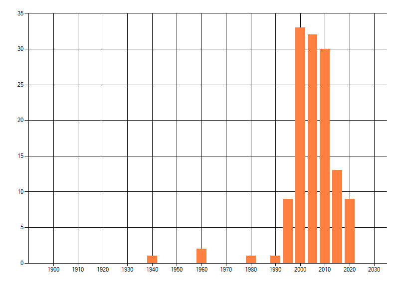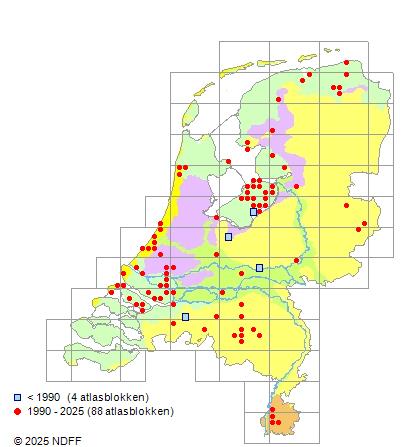 Het aantal atlasblokken (5x5 km) waarin de soort is gemeld binnen een periode van vijf jaar (vanaf 1980) of twintig jaar. Niet gecorrigeerd voor waarnemersinspanning en het aantal doorgegeven waarnemingen kan sterk variëren per periode, dus een trend in verspreiding kan hier niet direct uit worden afgelezen. Het opgegeven jaartal is het eerste jaar van de periode. Bron: gevalideerde waarnemingen uit de NDFF.