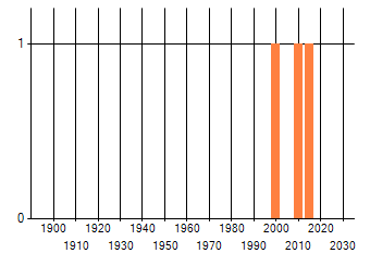 Het aantal atlasblokken (5x5 km) waarin de soort is gemeld binnen een periode van vijf jaar (vanaf 1980) of twintig jaar. Niet gecorrigeerd voor waarnemersinspanning en het aantal doorgegeven waarnemingen kan sterk variëren per periode, dus een trend in verspreiding kan hier niet direct uit worden afgelezen. Het opgegeven jaartal is het eerste jaar van de periode. Bron: gevalideerde waarnemingen uit de NDFF.
