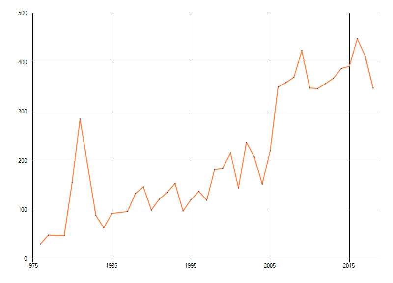 Gemiddelde trend van het aantal kilometerhokken waarin de soort voorkomt, weergegeven als indexcijfer (1975-1978 = 100). De trend is gecorrigeerd voor waarnemersinspanning en geeft de relatieve verandering in het aantal bezette kilometerhokken weer. Voor de berekening worden de data per periode van vier jaar samengenomen. In de grafiek correspondeert ieder punt met het laatste jaar van zo'n periode.