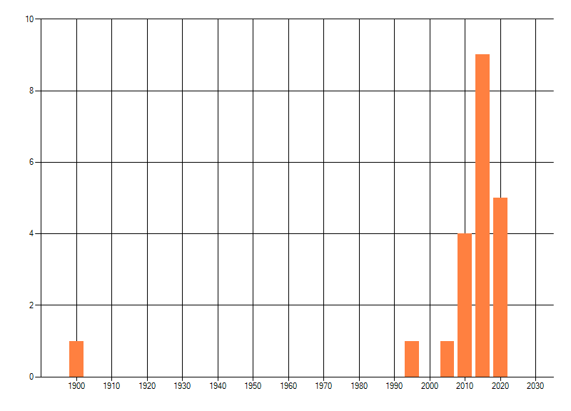 Het aantal atlasblokken (5x5 km) waarin de soort is gemeld binnen een periode van vijf jaar (vanaf 1980) of twintig jaar. Niet gecorrigeerd voor waarnemersinspanning en het aantal doorgegeven waarnemingen kan sterk variëren per periode, dus een trend in verspreiding kan hier niet direct uit worden afgelezen. Het opgegeven jaartal is het eerste jaar van de periode. Bron: gevalideerde waarnemingen uit de NDFF.