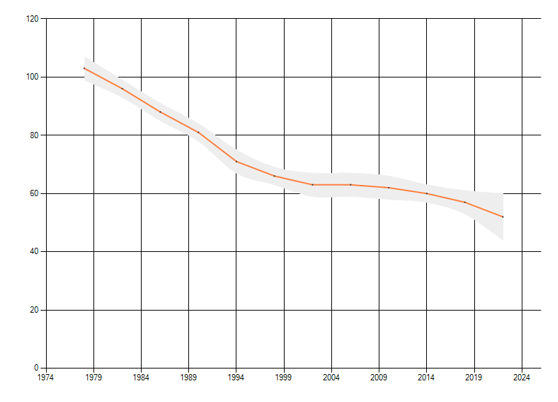 Gemiddelde trend van het aantal kilometerhokken waarin de soort voorkomt, weergegeven als indexcijfer (1975-1978 = 100).