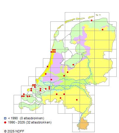 Het aantal atlasblokken (5x5 km) waarin de soort is gemeld binnen een periode van vijf jaar (vanaf 1980) of twintig jaar. Niet gecorrigeerd voor waarnemersinspanning en het aantal doorgegeven waarnemingen kan sterk variëren per periode, dus een trend in verspreiding kan hier niet direct uit worden afgelezen. Het opgegeven jaartal is het eerste jaar van de periode. Bron: gevalideerde waarnemingen uit de NDFF.