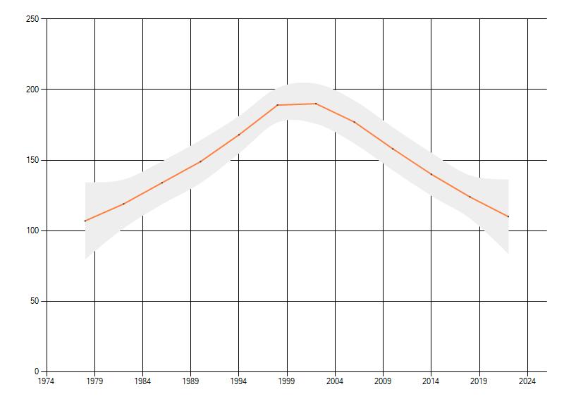 Gemiddelde trend van het aantal kilometerhokken waarin de soort voorkomt, weergegeven als indexcijfer (1975-1978 = 100).