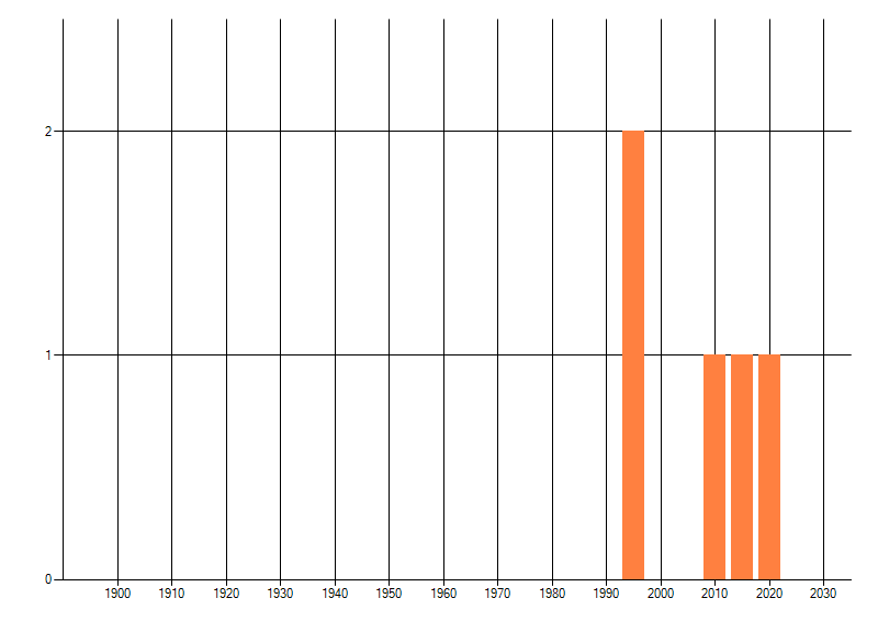 Het aantal atlasblokken (5x5 km) waarin de soort is gemeld binnen een periode van vijf jaar (vanaf 1980) of twintig jaar. Niet gecorrigeerd voor waarnemersinspanning en het aantal doorgegeven waarnemingen kan sterk variëren per periode, dus een trend in verspreiding kan hier niet direct uit worden afgelezen. Het opgegeven jaartal is het eerste jaar van de periode. Bron: gevalideerde waarnemingen uit de NDFF.