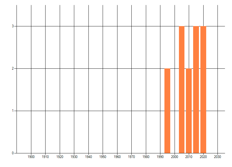Het aantal atlasblokken (5x5 km) waarin de soort is gemeld binnen een periode van vijf jaar (vanaf 1980) of twintig jaar. Niet gecorrigeerd voor waarnemersinspanning en het aantal doorgegeven waarnemingen kan sterk variëren per periode, dus een trend in verspreiding kan hier niet direct uit worden afgelezen. Het opgegeven jaartal is het eerste jaar van de periode. Bron: gevalideerde waarnemingen uit de NDFF.