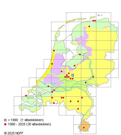 Het aantal atlasblokken (5x5 km) waarin de soort is gemeld binnen een periode van vijf jaar (vanaf 1980) of twintig jaar. Niet gecorrigeerd voor waarnemersinspanning en het aantal doorgegeven waarnemingen kan sterk variëren per periode, dus een trend in verspreiding kan hier niet direct uit worden afgelezen. Het opgegeven jaartal is het eerste jaar van de periode. Bron: gevalideerde waarnemingen uit de NDFF.