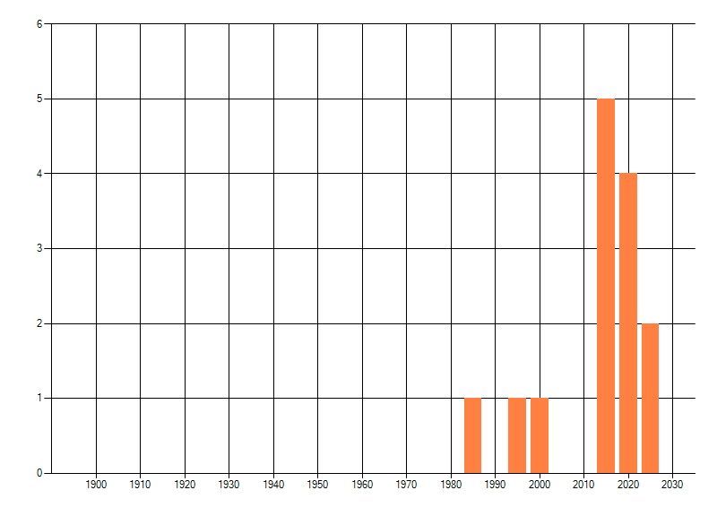 Het aantal atlasblokken (5x5 km) waarin de soort is gemeld binnen een periode van vijf jaar (vanaf 1980) of twintig jaar. Niet gecorrigeerd voor waarnemersinspanning en het aantal doorgegeven waarnemingen kan sterk variëren per periode, dus een trend in verspreiding kan hier niet direct uit worden afgelezen. Het opgegeven jaartal is het eerste jaar van de periode. Bron: gevalideerde waarnemingen uit de NDFF.