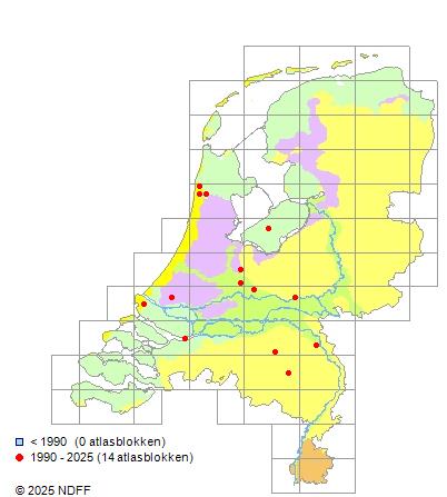 Het aantal atlasblokken (5x5 km) waarin de soort is gemeld binnen een periode van vijf jaar (vanaf 1980) of twintig jaar. Niet gecorrigeerd voor waarnemersinspanning en het aantal doorgegeven waarnemingen kan sterk variëren per periode, dus een trend in verspreiding kan hier niet direct uit worden afgelezen. Het opgegeven jaartal is het eerste jaar van de periode. Bron: gevalideerde waarnemingen uit de NDFF.