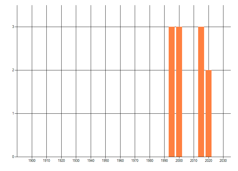 Het aantal atlasblokken (5x5 km) waarin de soort is gemeld binnen een periode van vijf jaar (vanaf 1980) of twintig jaar. Niet gecorrigeerd voor waarnemersinspanning en het aantal doorgegeven waarnemingen kan sterk variëren per periode, dus een trend in verspreiding kan hier niet direct uit worden afgelezen. Het opgegeven jaartal is het eerste jaar van de periode. Bron: gevalideerde waarnemingen uit de NDFF.