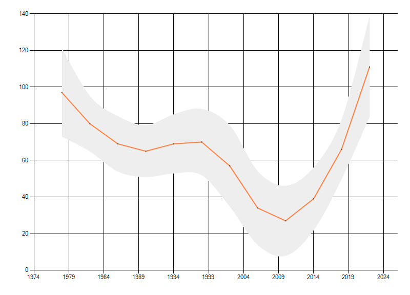 In de grafiek correspondeert ieder punt met het laatste jaar van zo'n periode. © NEM(CBS & FLORON) 2023