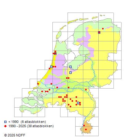 Het aantal atlasblokken (5x5 km) waarin de soort is gemeld binnen een periode van vijf jaar (vanaf 1980) of twintig jaar. Niet gecorrigeerd voor waarnemersinspanning en het aantal doorgegeven waarnemingen kan sterk variëren per periode, dus een trend in verspreiding kan hier niet direct uit worden afgelezen. Het opgegeven jaartal is het eerste jaar van de periode. Bron: gevalideerde waarnemingen uit de NDFF.