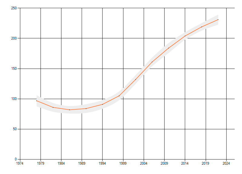 Gemiddelde trend van het aantal kilometerhokken waarin de soort voorkomt, weergegeven als indexcijfer (1975-1978 = 100).