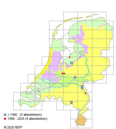 Het aantal atlasblokken (5x5 km) waarin de soort is gemeld binnen een periode van vijf jaar (vanaf 1980) of twintig jaar. Niet gecorrigeerd voor waarnemersinspanning en het aantal doorgegeven waarnemingen kan sterk variëren per periode, dus een trend in verspreiding kan hier niet direct uit worden afgelezen. Het opgegeven jaartal is het eerste jaar van de periode. Bron: gevalideerde waarnemingen uit de NDFF.