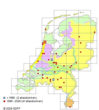 Het aantal atlasblokken (5x5 km) waarin de soort is gemeld binnen een periode van vijf jaar (vanaf 1980) of twintig jaar. Niet gecorrigeerd voor waarnemersinspanning en het aantal doorgegeven waarnemingen kan sterk variëren per periode, dus een trend in verspreiding kan hier niet direct uit worden afgelezen. Het opgegeven jaartal is het eerste jaar van de periode. Bron: gevalideerde waarnemingen uit de NDFF.
