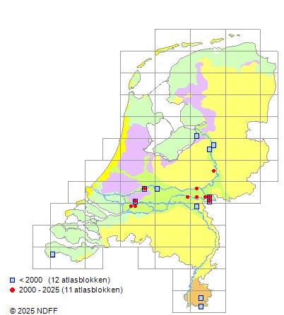 Het aantal atlasblokken (5x5 km) waarin de soort is gemeld binnen een periode van vijf jaar (vanaf 1980) of twintig jaar. Niet gecorrigeerd voor waarnemersinspanning en het aantal doorgegeven waarnemingen kan sterk variëren per periode, dus een trend in verspreiding kan hier niet direct uit worden afgelezen. Het opgegeven jaartal is het eerste jaar van de periode. Bron: gevalideerde waarnemingen uit de NDFF.